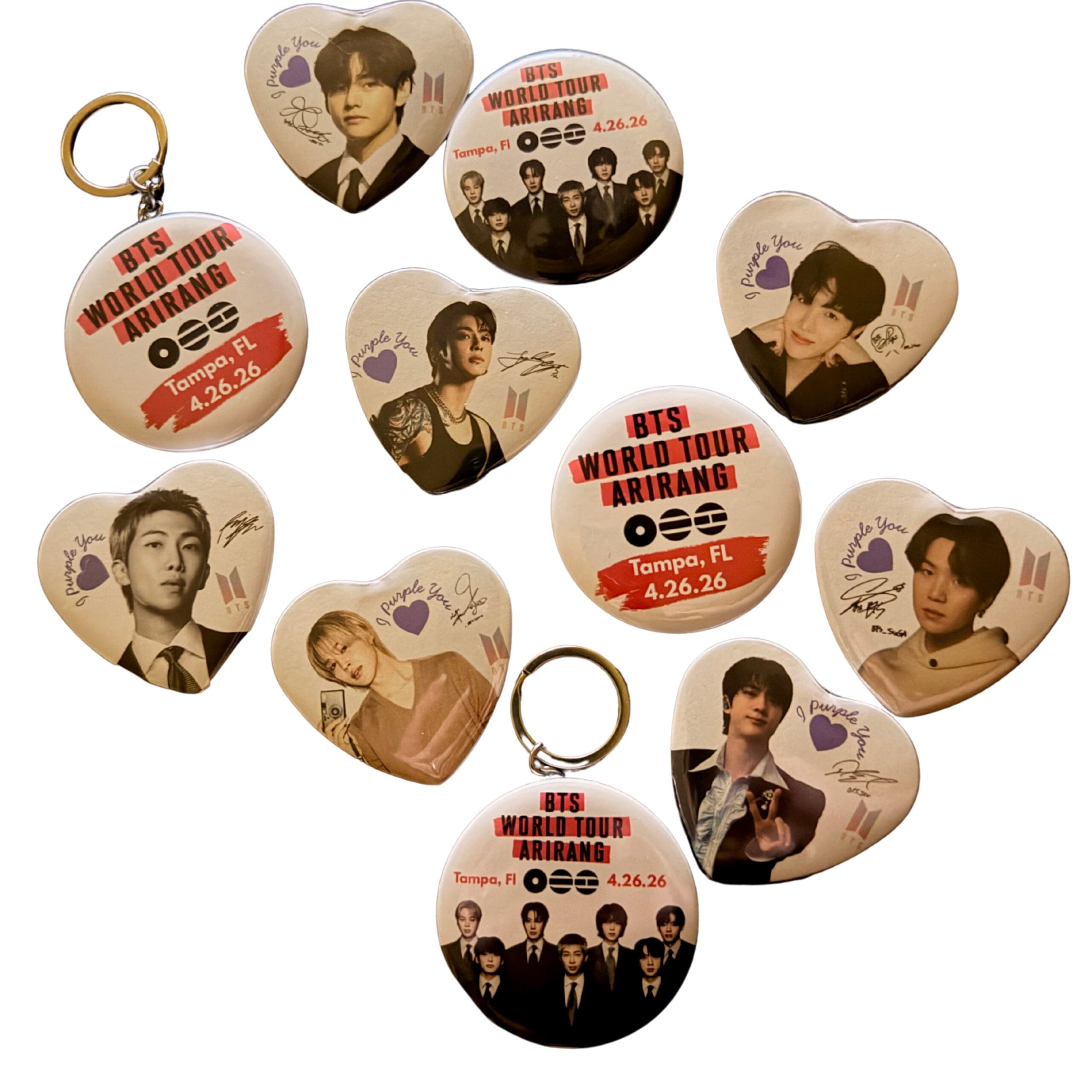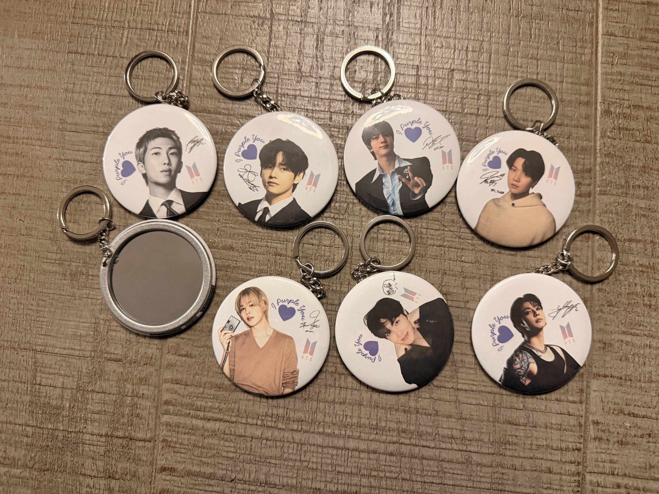 Show your love for BTS with these fun and stylish fan accessories! Featuring a variety of shapes and styles—including circle buttons, heart buttons, circle keychains, and circle mirror keychains—these pieces are perfect for adding personality to your everyday look.